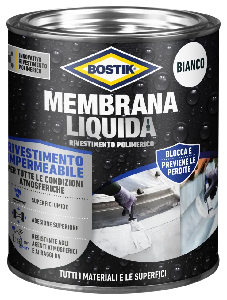 Aprire la latta e applicare un primo strato a pennello sulla superficie. Applicare in 2 strati. Lasciare indurire adeguatamente il primo strato prima di applicare lo strato successivo (circa 6 - 8 ore*). Per le fessure è necessario utilizzare Bostik Gomma Liquida Banda Rinforzante. Premi Bostik Gomma Liquida Banda Rinforzante nel primo strato ancora umido finché non è completamente saturo. Applicare il secondo strato entro 1 ora. Garantire sempre uno spessore dello strato di almeno 1,5 mm dopo l'indurimento.
