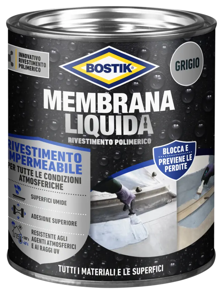 Aprire la latta e applicare un primo strato a pennello sulla superficie. Applicare in 2 strati. Lasciare indurire adeguatamente il primo strato prima di applicare lo strato successivo (circa 6 - 8 ore*). Per le fessure è necessario utilizzare Bostik Gomma Liquida Banda Rinforzante. Premi Bostik Gomma Liquida Banda Rinforzante nel primo strato ancora umido finché non è completamente saturo. Applicare il secondo strato entro 1 ora. Garantire sempre uno spessore dello strato di almeno 1,5 mm dopo l'indurimento.