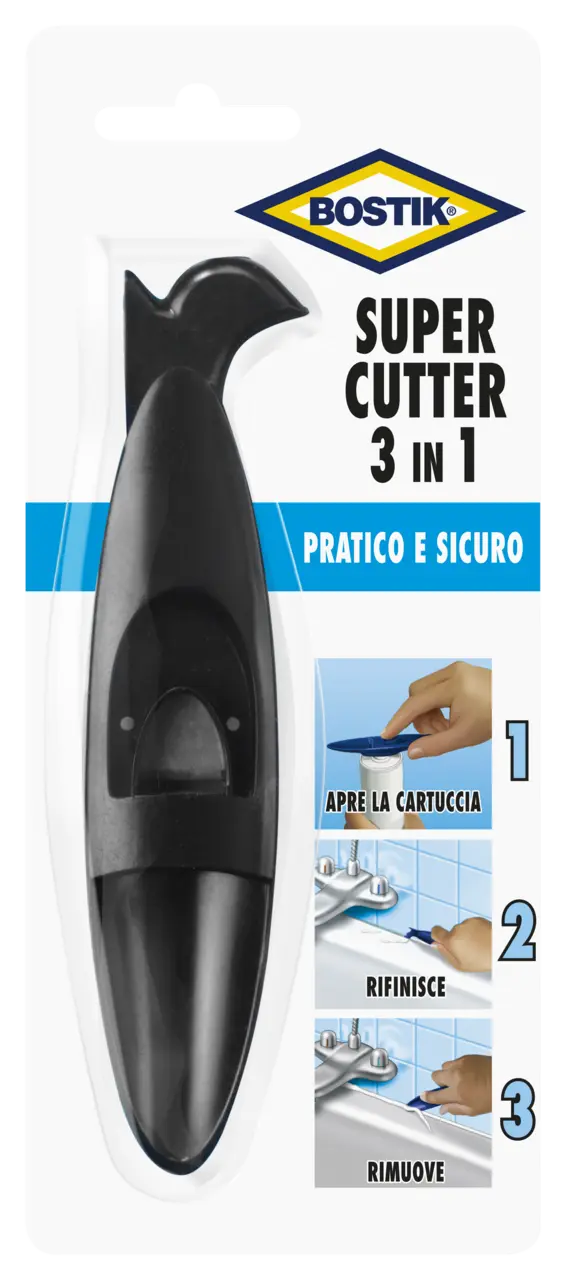 (1)Aprire la cartuccia / tagliare il beccuccio Apertura del beccuccio: applicare il Super Cutter direttamente sull’apertura della cartuccia (il nipplo in plastica con la vite). Tagliare l’apertura della cartuccia con il coltello fornito in dotazione. Taglio del beccuccio: Con il coltello fornito in dotazione, tagliare il beccuccio in obliquo sul diametro desiderato. (2)Rifinire / eliminare il sigillante in eccesso Dopo avere applicato il sigillante, inumidirlo con acqua e sapone. Inumidire il lato uncinato del Super Cutter con acqua e sapone. Applicarlo sul silicone e tagliare il silicone in eccesso con un coltello con un movimento spedito. Il sigillante in eccesso viene raccolto nel cucchiaio. Per le fughe piccole, appoggiare il Super Cutter in verticale sulla giuntura con il sigillante. Se le fughe sono più grandi, tenere piatto il Super Cutter. Levigare con le dita inumidite le eventuali irregolarità. (3)Rimuovere il sigillante indurito Infilare la parte uncinata del Super Cutter nel sigillante indurito e staccare il sigillante. Utilizzare la parte puntiforme nei punti più difficili (ad esempio negli angoli).